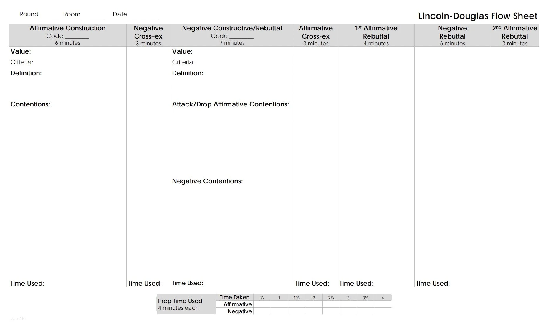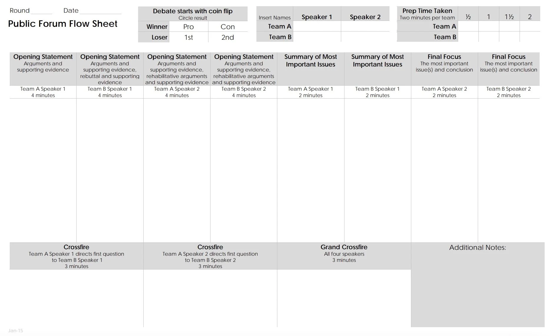 Flowing is taking notes during your opponent’s speech. You are writing down what they say. Debaters flow to organize the debate and record which arguments they need to answer in their speech. After the debate, the judge will look at their own flow and decide who won based on what both sides have said in the debate.